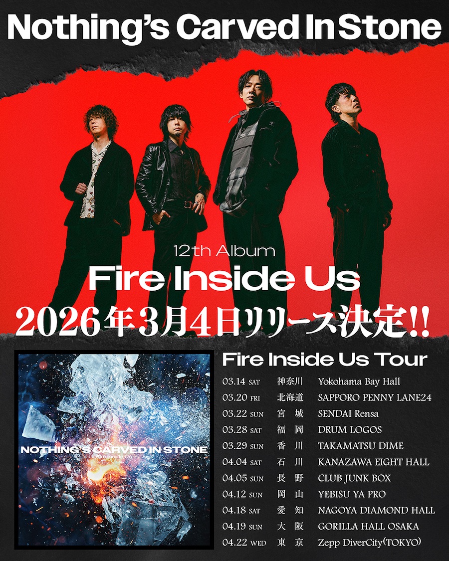| Title | Nothing’s Carved In Stone “Fire Inside Us Tour” | | 出演 | ■Nothing’s Carved In Stone | | 詳細 | 前売券¥5500- ※学割チケットあり (ドリンク代¥600-別途必要) | | 時間 | open 17:00 / start 17:30 | | [INFO] | DUKE高松 087-822-2520 |